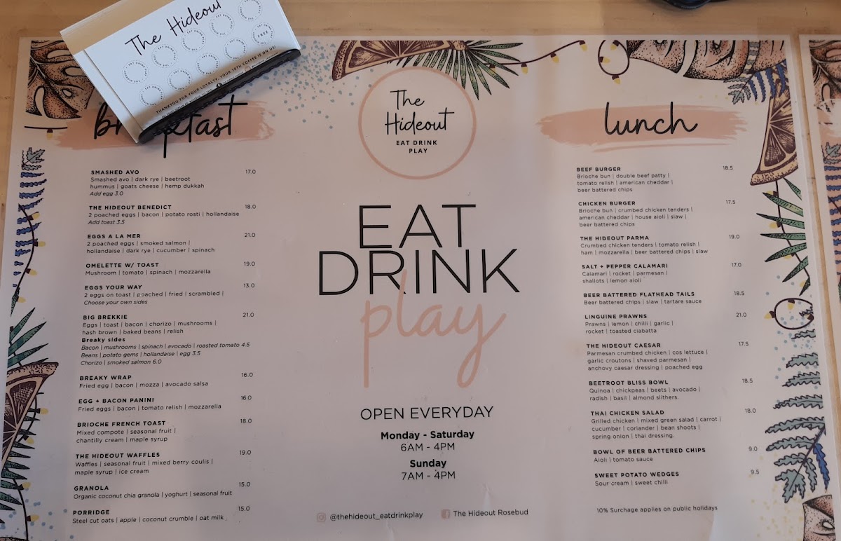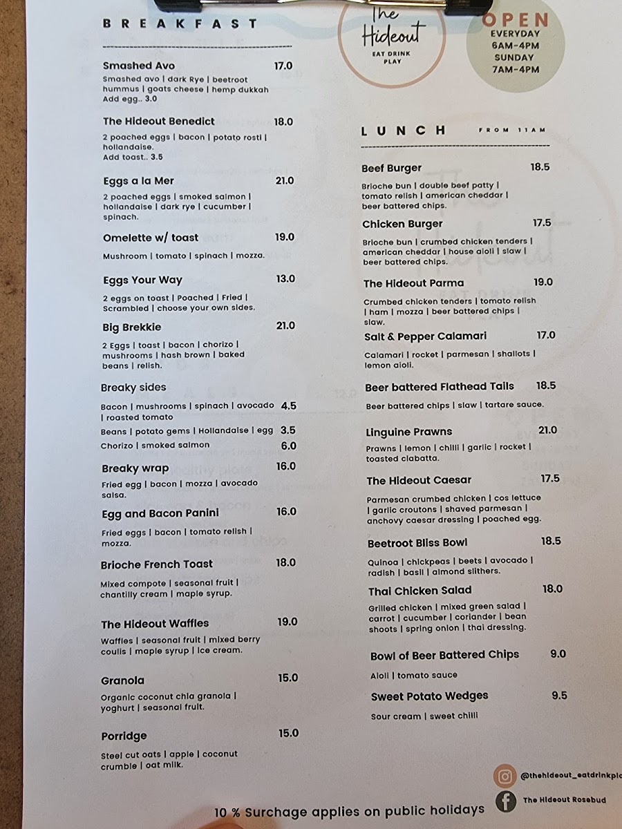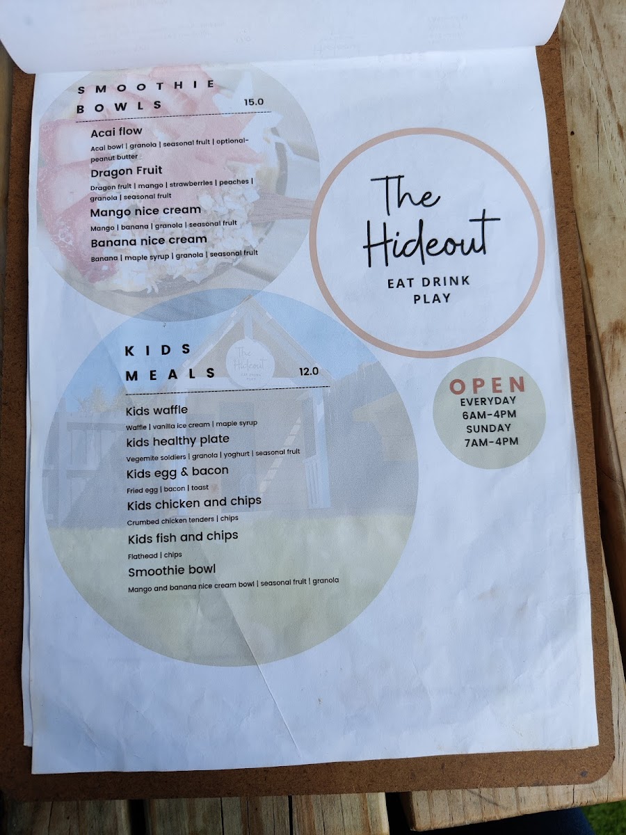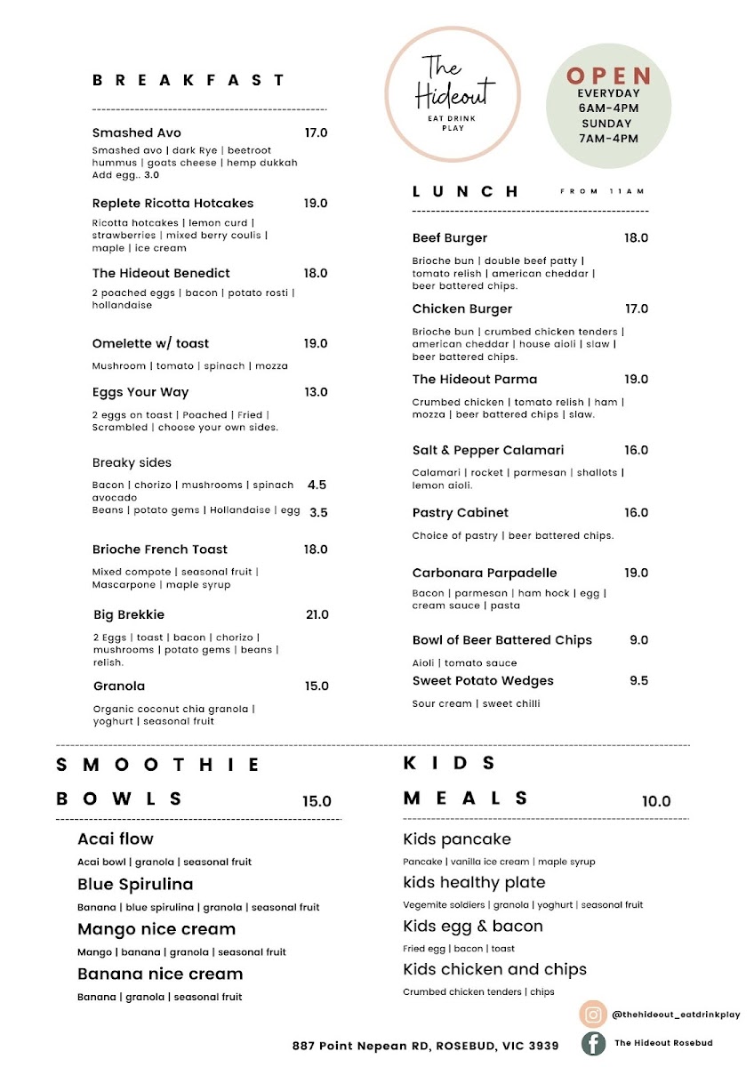The menu at The Hideout Eat Drink Play at 887 Point Nepean Rd, Rosebud, offers a satisfying mix of breakfast, lunch, and lighter options, catering to a wide range of tastes. Breakfast choices like Smashed Avo, The Hideout Benedict, Eggs A La Mer Omelette W/ Toast, and Eggs Your Way promise fresh, hearty starts to the day, while the Breaky Wrap, Egg And Bacon Panini, and Brioche French Toast bring indulgent twists to classic morning fare. Lunch highlights include the Beef Burger, Chicken Burger, The Hideout Parma, Salt & Pepper Calamari, and the The Hideout Caesar, offering familiar favorites with generous portions. For younger diners, the Kids Pancake, Kids Healthy Plate, Kids Egg & Bacon, and Kids Chicken And Chips provide approachable, fun meals. Health-conscious or sweet-toothed guests can enjoy smoothie bowls such as the Acai Flow, Dragon Fruit, and Mango Nice Cream, alongside the Banana Nice Cream. Desserts like The Hideout Waffles and Brioche French Toast round out the menu, ensuring there’s something for everyone. Overall, the menu combines comforting classics with playful, fresh options, making it an appealing spot for families and casual diners alike.