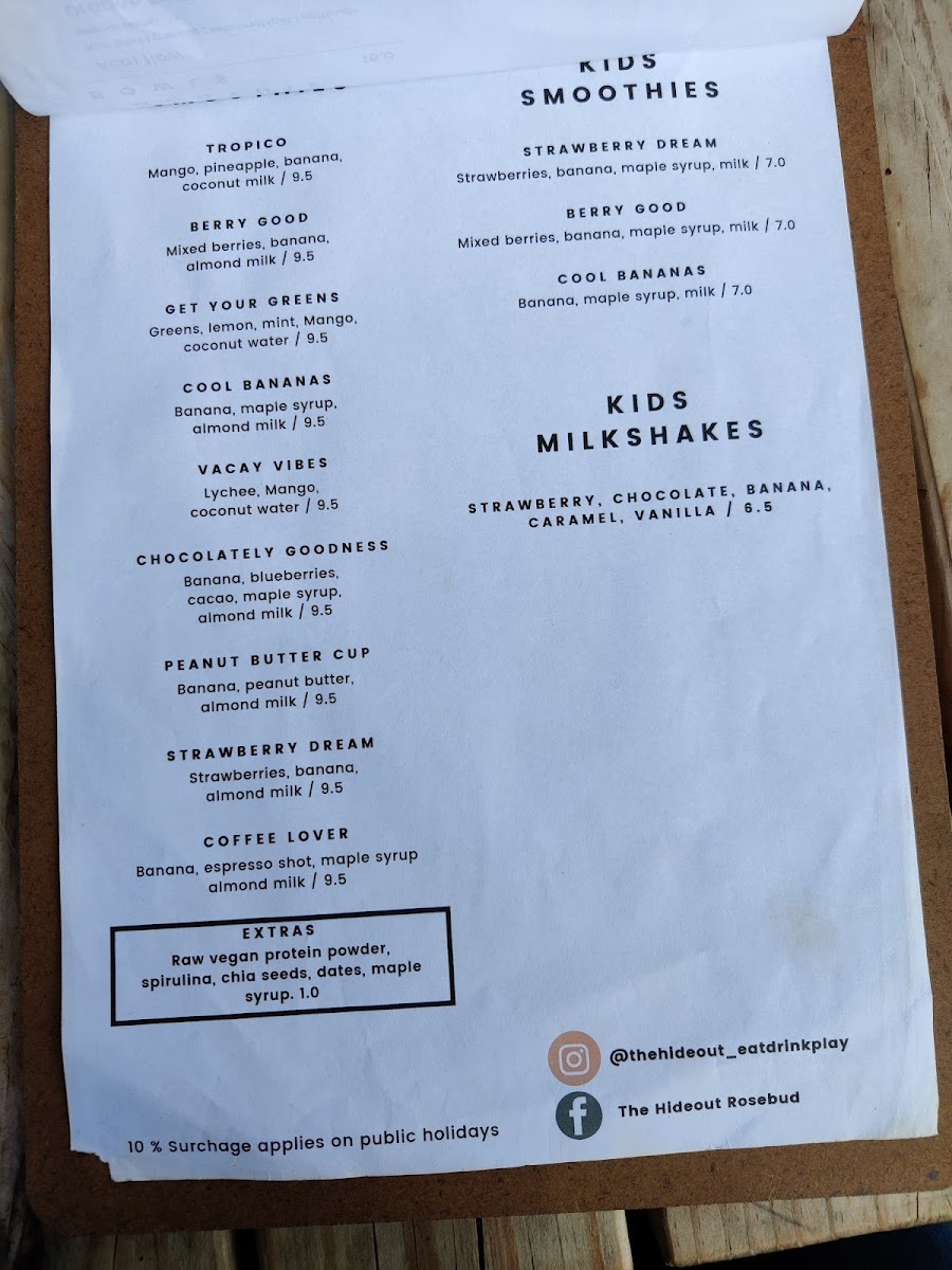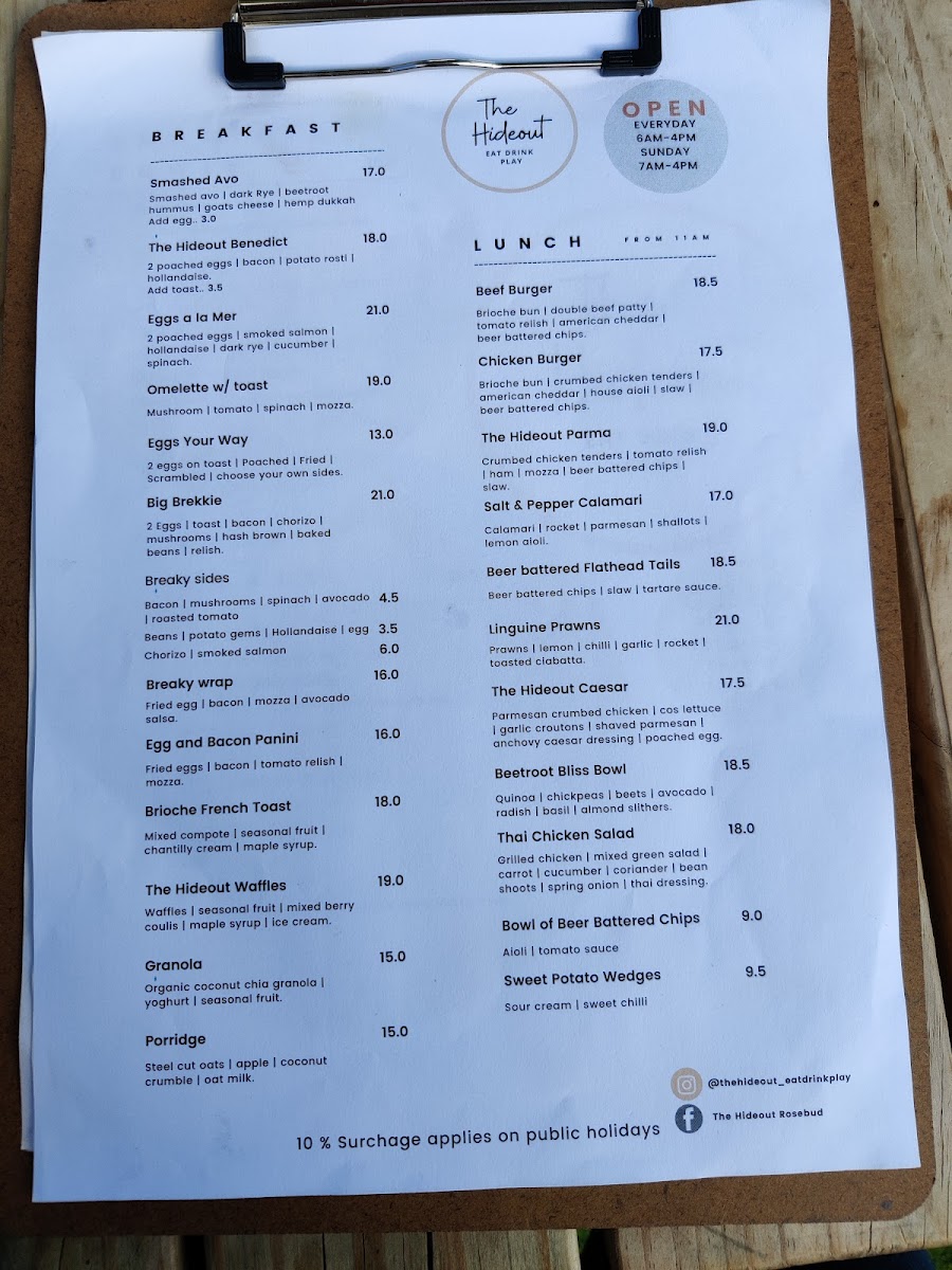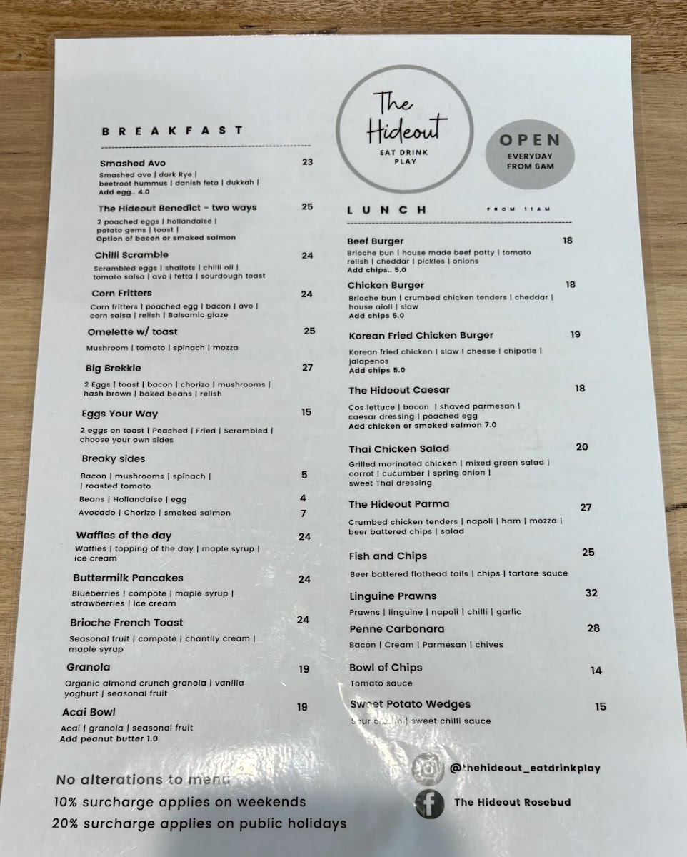 The menu at The Hideout Eat Drink Play at 887 Point Nepean Rd, Rosebud, offers a satisfying mix of breakfast, lunch, and lighter options, catering to a wide range of tastes. Breakfast choices like Smashed Avo, The Hideout Benedict, Eggs A La Mer Omelette W/ Toast, and Eggs Your Way promise fresh, hearty starts to the day, while the Breaky Wrap, Egg And Bacon Panini, and Brioche French Toast bring indulgent twists to classic morning fare. Lunch highlights include the Beef Burger, Chicken Burger, The Hideout Parma, Salt & Pepper Calamari, and the The Hideout Caesar, offering familiar favorites with generous portions. For younger diners, the Kids Pancake, Kids Healthy Plate, Kids Egg & Bacon, and Kids Chicken And Chips provide approachable, fun meals. Health-conscious or sweet-toothed guests can enjoy smoothie bowls such as the Acai Flow, Dragon Fruit, and Mango Nice Cream, alongside the Banana Nice Cream. Desserts like The Hideout Waffles and Brioche French Toast round out the menu, ensuring there’s something for everyone. Overall, the menu combines comforting classics with playful, fresh options, making it an appealing spot for families and casual diners alike.